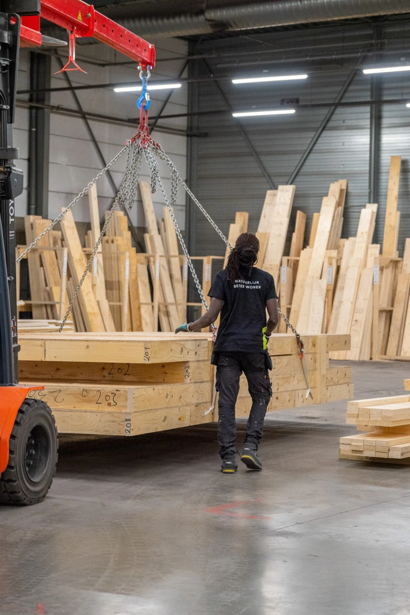Ons atelier van meer dan 12000 m² bestaat uit 5 hallen met elk een specifieke invulling. Zo hebben we een ruimte voor geautomatiseerde wandproductie en een sectie waar de onderdelen van modulaire woningen vorm krijgen. We hebben ook plaats voor de afwerking van iedere module en een aparte hal die als transportzone dient. Daarnaast stockeren we ook al onze materialen onder hetzelfde dak.