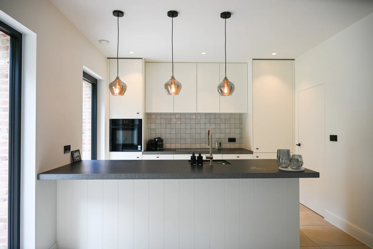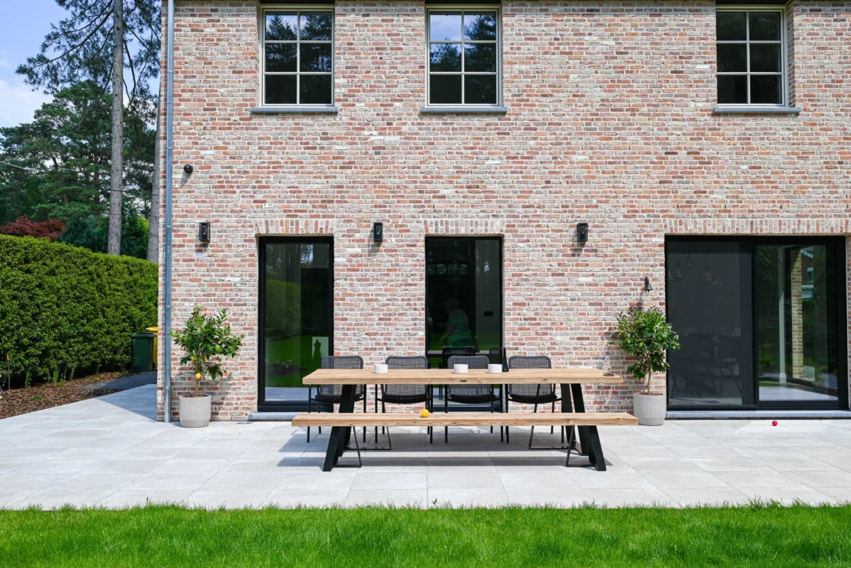 Dankzij de doordachte indeling, grote glaspartijen en de ruime leefkeuken genieten de bewoners van veel licht en leefcomfort. De achtertuin werd naadloos betrokken bij de woning, met een royaal terras dat uitkijkt op het groene perceel: ideaal om te genieten en tot rust te komen.
