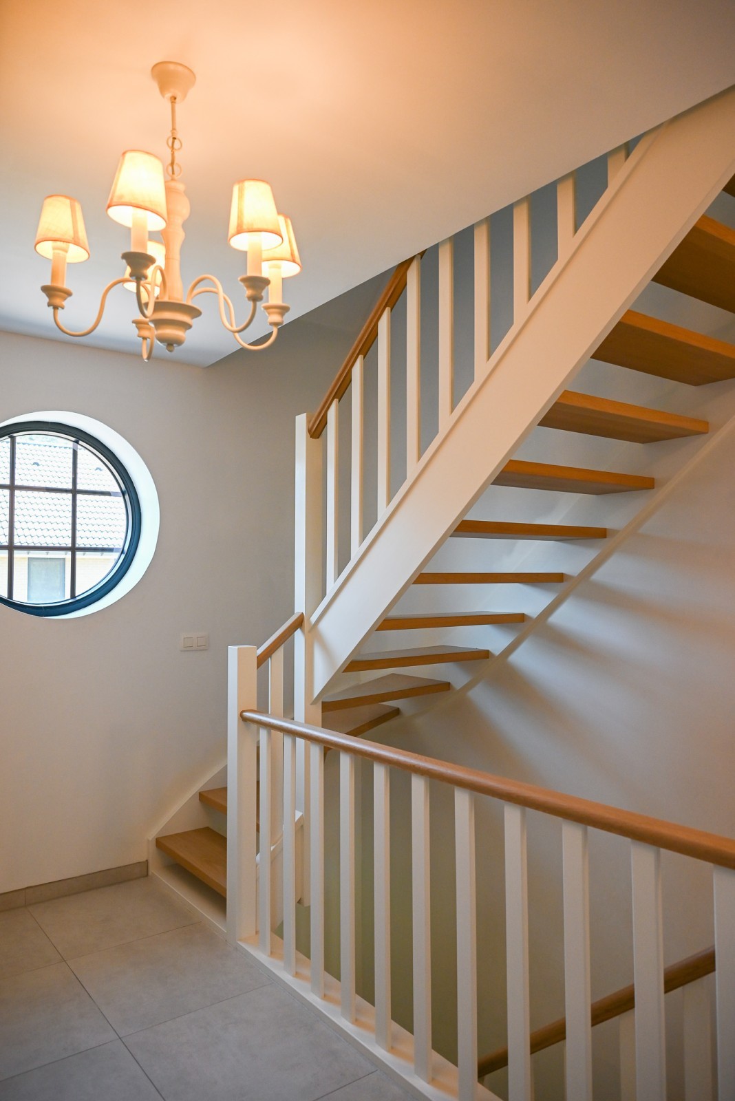 Deze charmante woning combineert een warme bakstenen gevel met een elegante houten voordeur en moderne ramen.